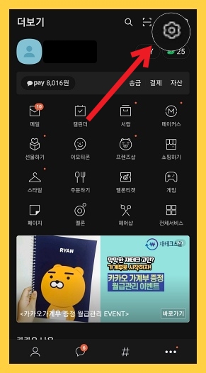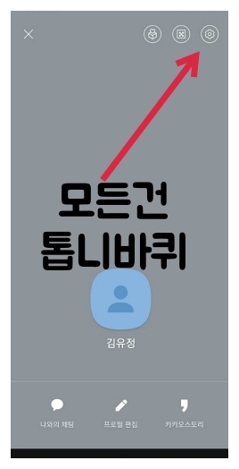 처음 카카오톡 홈에서 본인 프로필을 누르시고 오른쪽 상단에 톱니바퀴=설정이라는 국룰