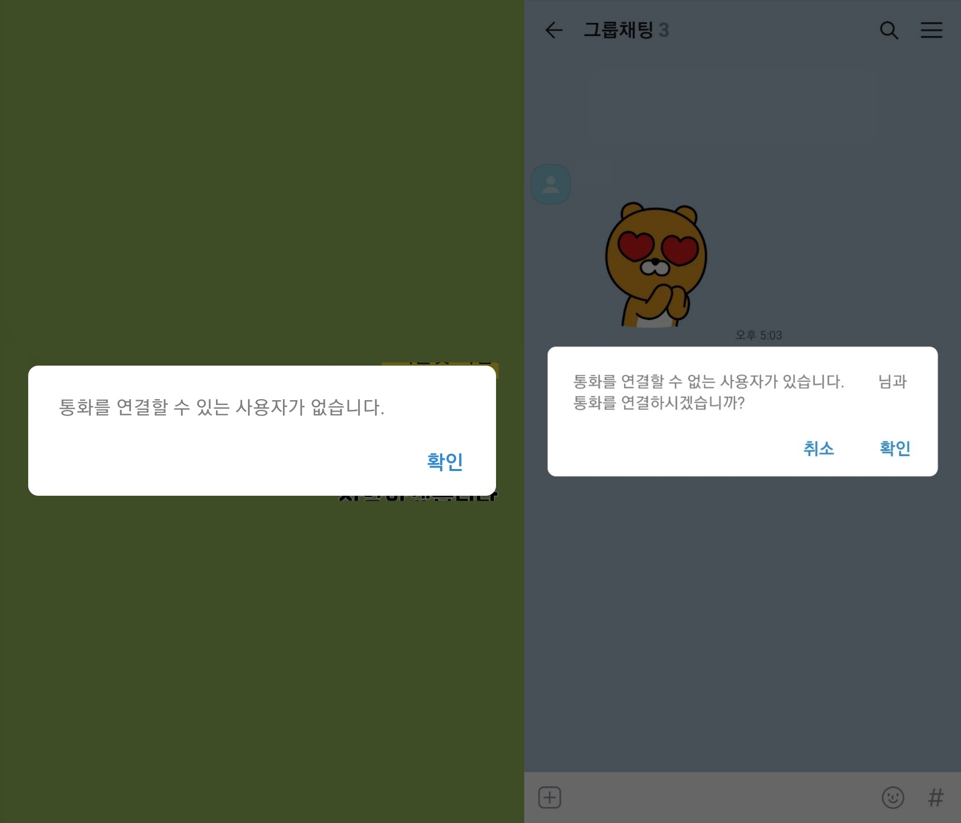 예를들어 3명의 단톡방인 경우에 1명이 안드로이드(삼성 갤럭시 LG )의 휴대폰인 경우에 통화를 연결할 수 있는 사용자가 없다고 나옵니다.