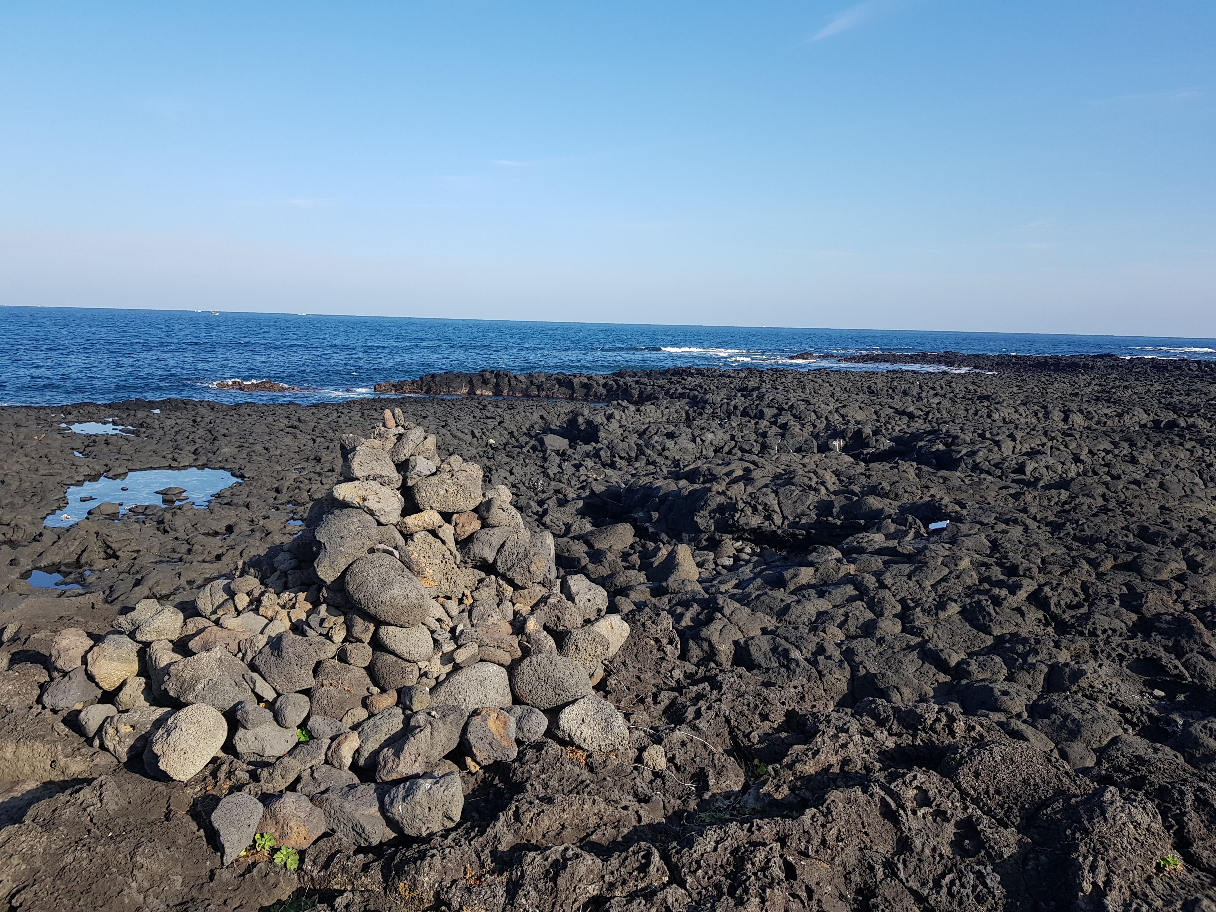 관광객들이 쌓아놓은 돌들로 신비로운 분위기가 더해집니다. 넓은 현무암으로 이루어진 바닷가가 신비로움을 더해주고 넓은 이 공간엔 바람과 바도 소리만 가득합니다. 관광객들의 발길이 적은 곳이라 조용하게 바다를 감상할 수 있는 좋은 장소입니다.