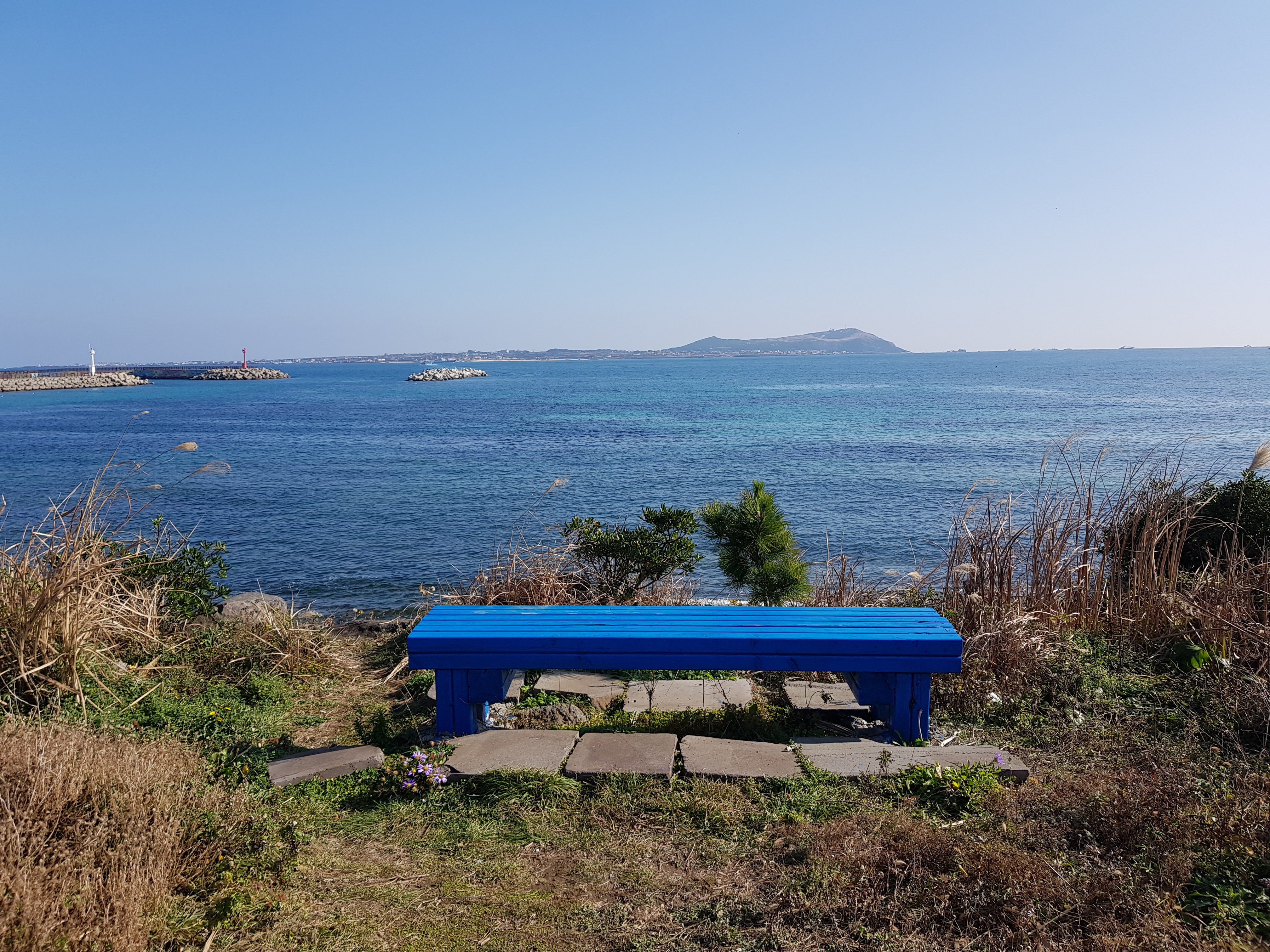 바로 인근에 위치한 지미봉입니다. 굳이 높은 산을 올라가지 않아도 좋은 제주도는 낮은 오름으로 충분히 그 감동을 느낄 수 있습니다. 위의 지미봉은 정상에 오르기에 약 20여분 소요되며 정상 인근의 전망대에는 우도가 한눈에 들어오는 좋은 풍경입니다. 시원하게 불어오는 바닷바람 맞으며 힘들게 올라간 산 전망대에서 시원한 바람과 화창 한하늘 그리고 그림 같은 바다에 나 홀로 앉아있는 우도 보기에 딱 좋은 곳입니다.