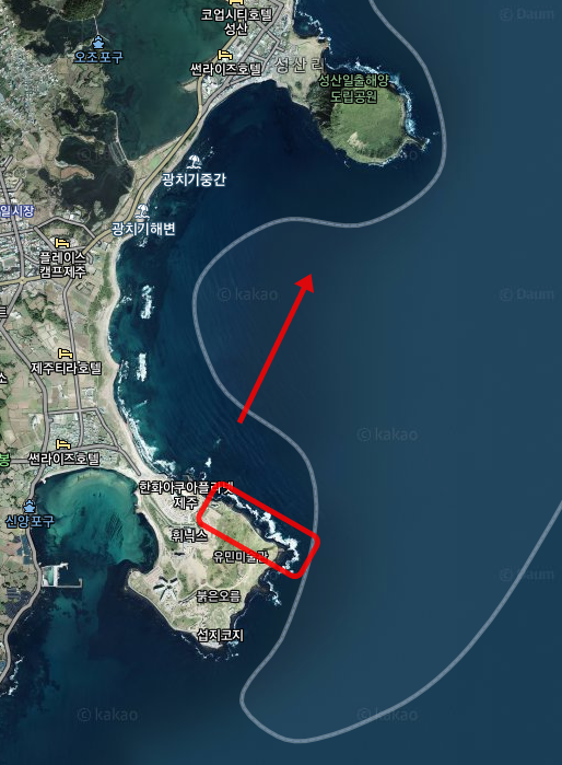 빨간색으로 표시된곳이며 섭지코지 인근에 위치하고 있습니다. 차량으로 들어갈 수 있으며 사람이 적고 조용해 바다 구경하기 딱 좋습니다. 그리고 반대편에는 성산일출봉의 남서쪽 벽면이 보여서 장관을 연출합니다.