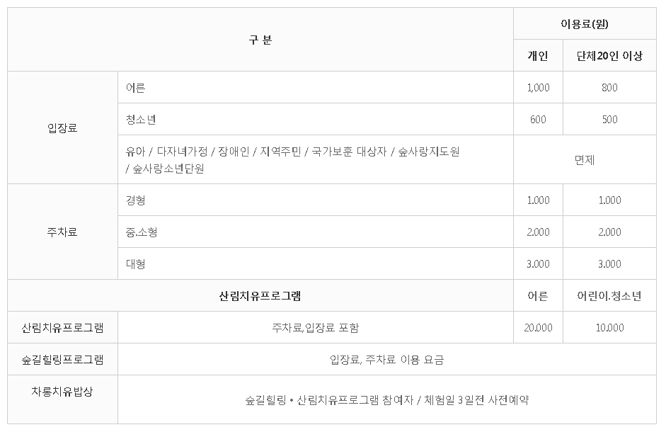 서귀포 치유의 숲 가격안내입니다. 입장료와 주차료는 매우 저렴한 편이며 산림치유 프로그램과 숲길 힐링 프로그램을 운영 중입니다. 이는 미리 홈페이지에서 예약을 통해서 체험할 수 있는 프로그램으로 홈페이지에 자세한 내용이 참조되어 있습니다.